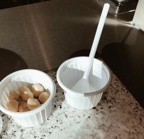 Devant nous, les noisettes, un petit pot pour notre propre dégustation car sur le côté se trouvent 2 bacs: un de chocolat noir et un de praliné tempéré, il suffit de se servir à la louche !! Après que tout le monde ait terminé de s’en mettre plein partout, l’opération Ragusa peut commencer.