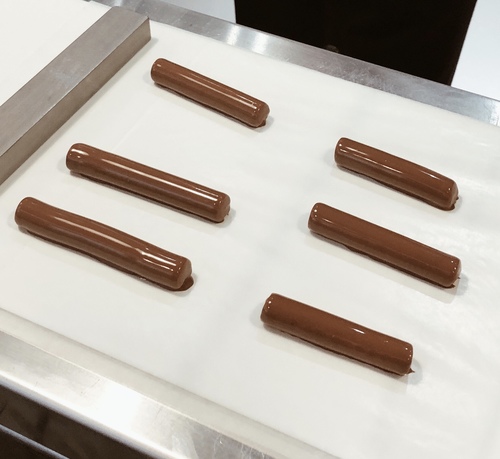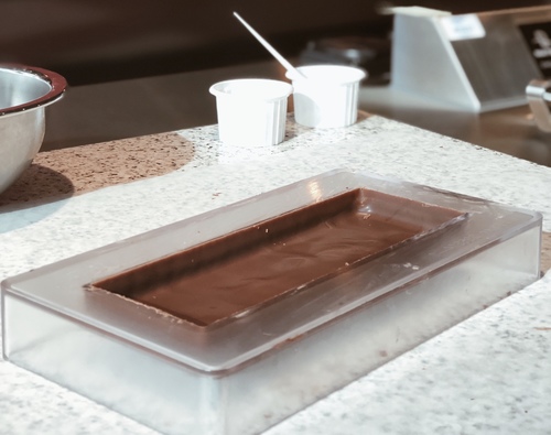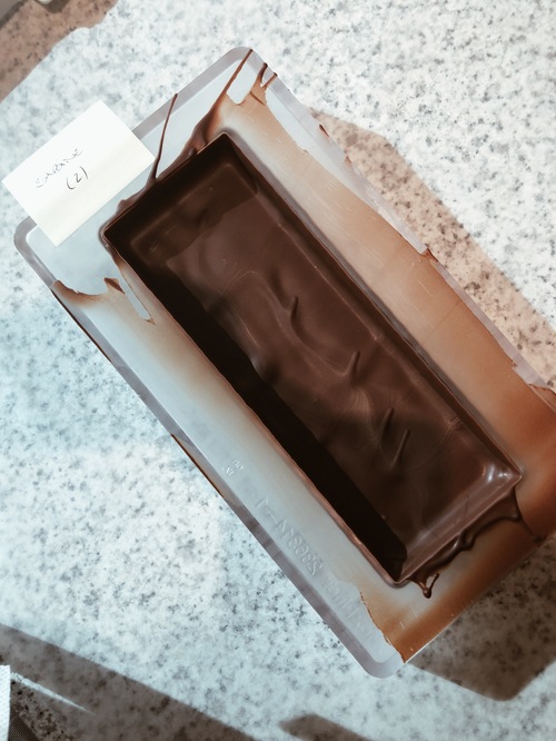 - Phase finale la dernière couche de chocolat noire qui vient terminer votre plaque. Là il faut être rigoureux et précis ne pas en mettre trop et l’étaler petite à petit. On peut toujours réajuster s’il y en a pas assez.