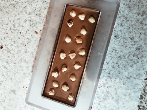 - Le praliné là y a 2 techniques : soit vous mélangez dans un cul de poule le praliné et les noisettes (là elles seront bien enrobées), soit vous déposez le praliné puis ensuite délicatement les noisettes mais… il vous faudra certainement rajouter un peu de praliné ou alors vous préférez quand il y en a moins.