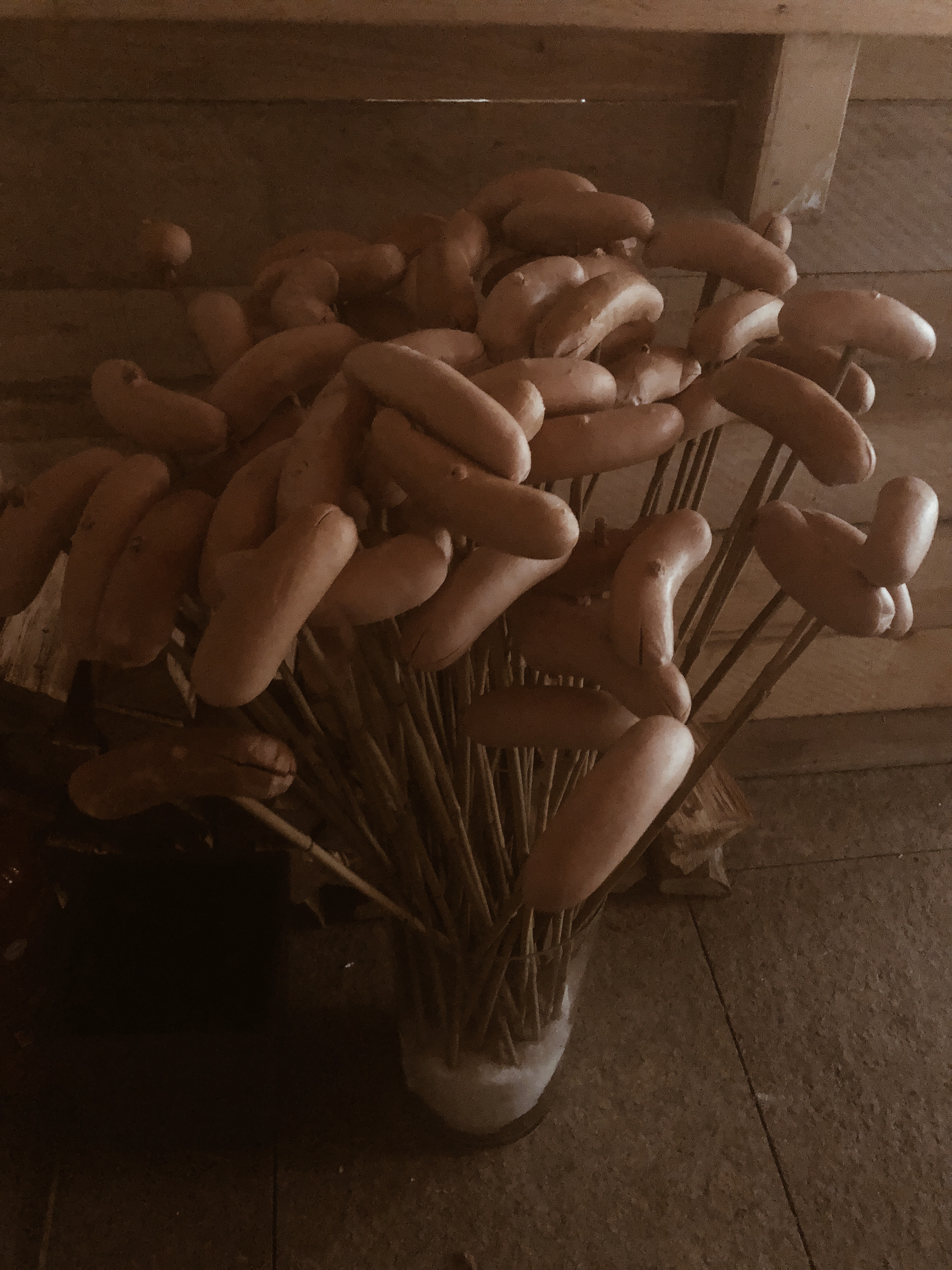 Après quelques verres de champagne, encore, nous sommes ressorties nous griller un petit cervelas. Tout de même, on ne pouvait pas partir sans cette activité ! Ils avaient même pensé à la moutarde !