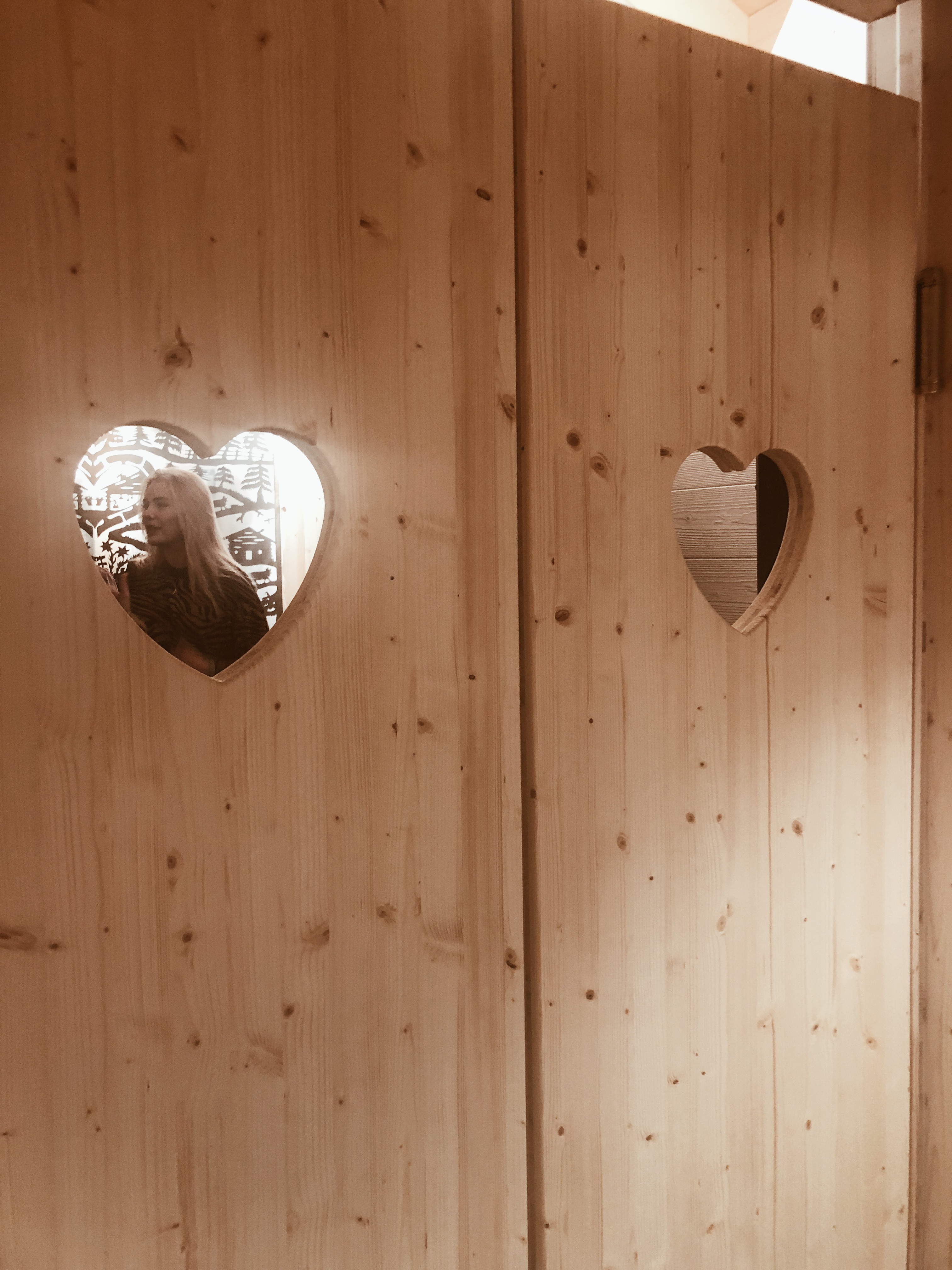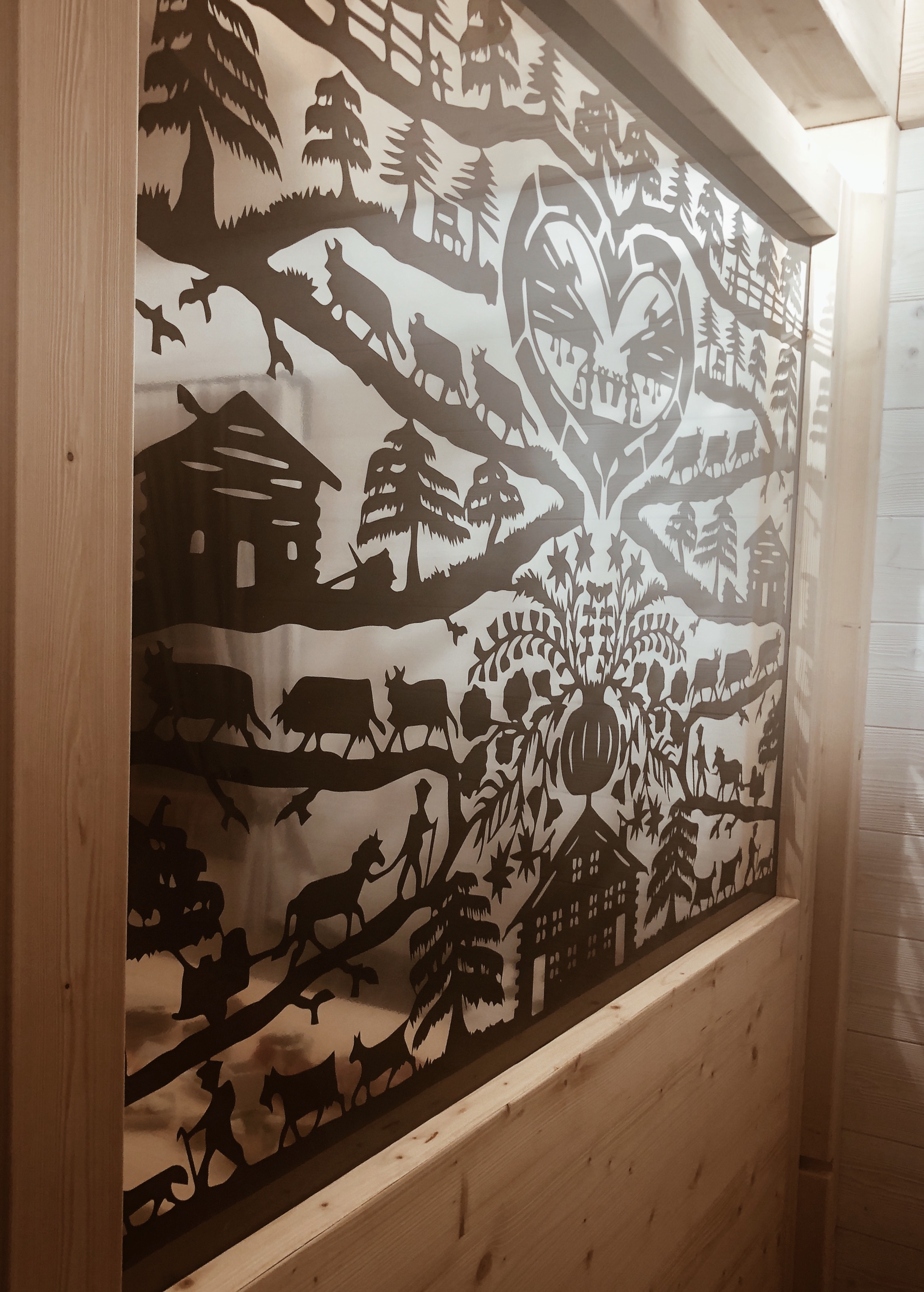 Puis on entre dans la salle à manger par deux portes battantes en chêne et des petits cœurs pour voir être travers trop mignons. C’est ensuite un décor de chalet, on se sent comme à la maison, à la montagne, des grandes tables en bois avec des coussins et des peaux de bêtes pour nous tenir chaud (c’est juste de la déco, vous inquiétez pas c’est chauffé, pas comme quand j’étais petite et qu’à chaque arrivée il fallait faire chauffer le poêle pour le weekend et attendre emmitouflée dans le salon avec une petite tartine au miel de grand-papa). Des fenêtres, des volets, des décors de découpage du Pays-d’en-Haut, de beaux lustres, un appareil à raclette défiant toute compétition pour une production d’apparemment 1500 raclettes à l’heure. C’est le mari du Ludivine qui s’est renseigné :-p tout est mis en place pour une soirée chic et swiss.Haha comme j’ai réussi à la placer celle-là !
