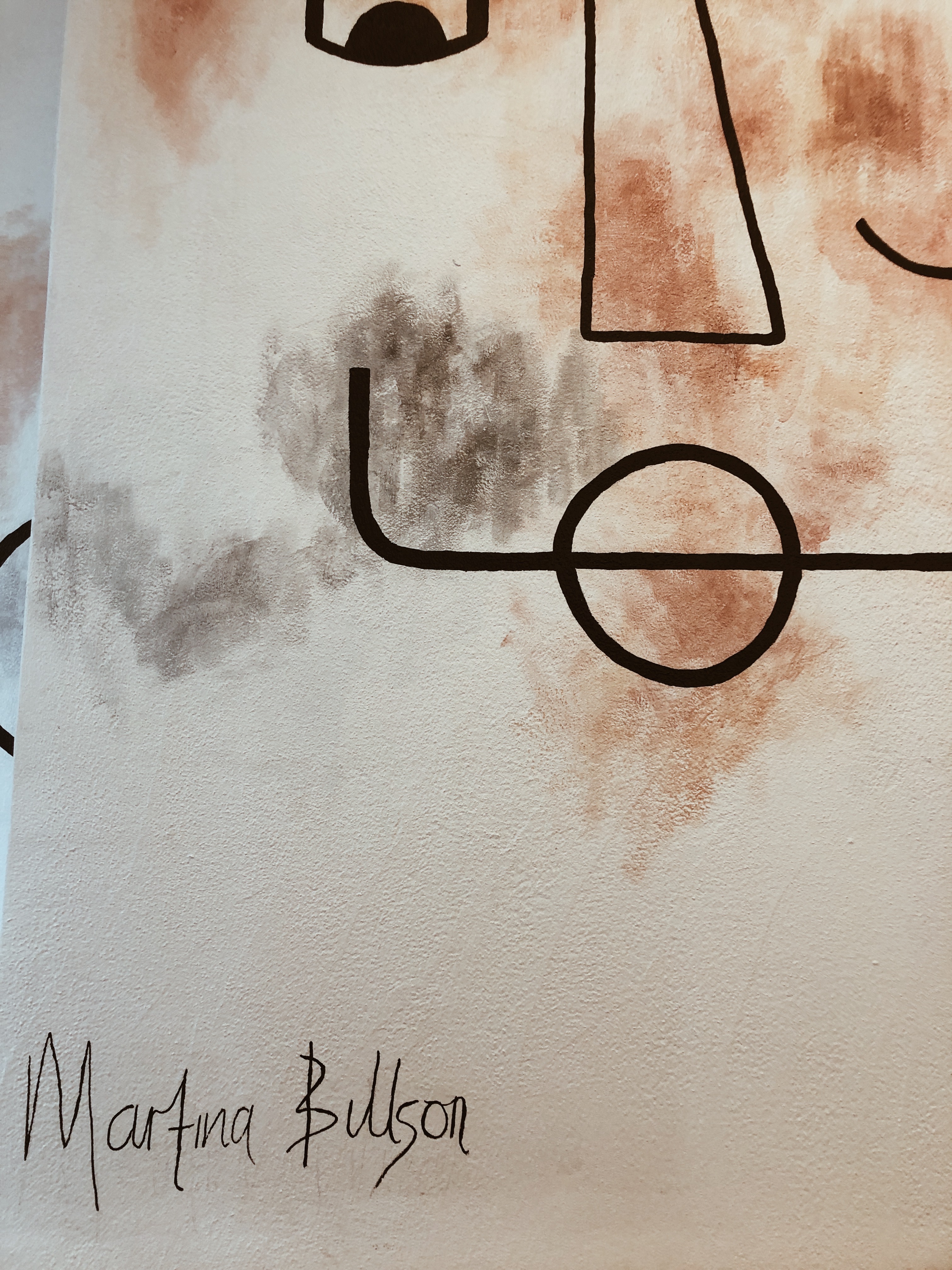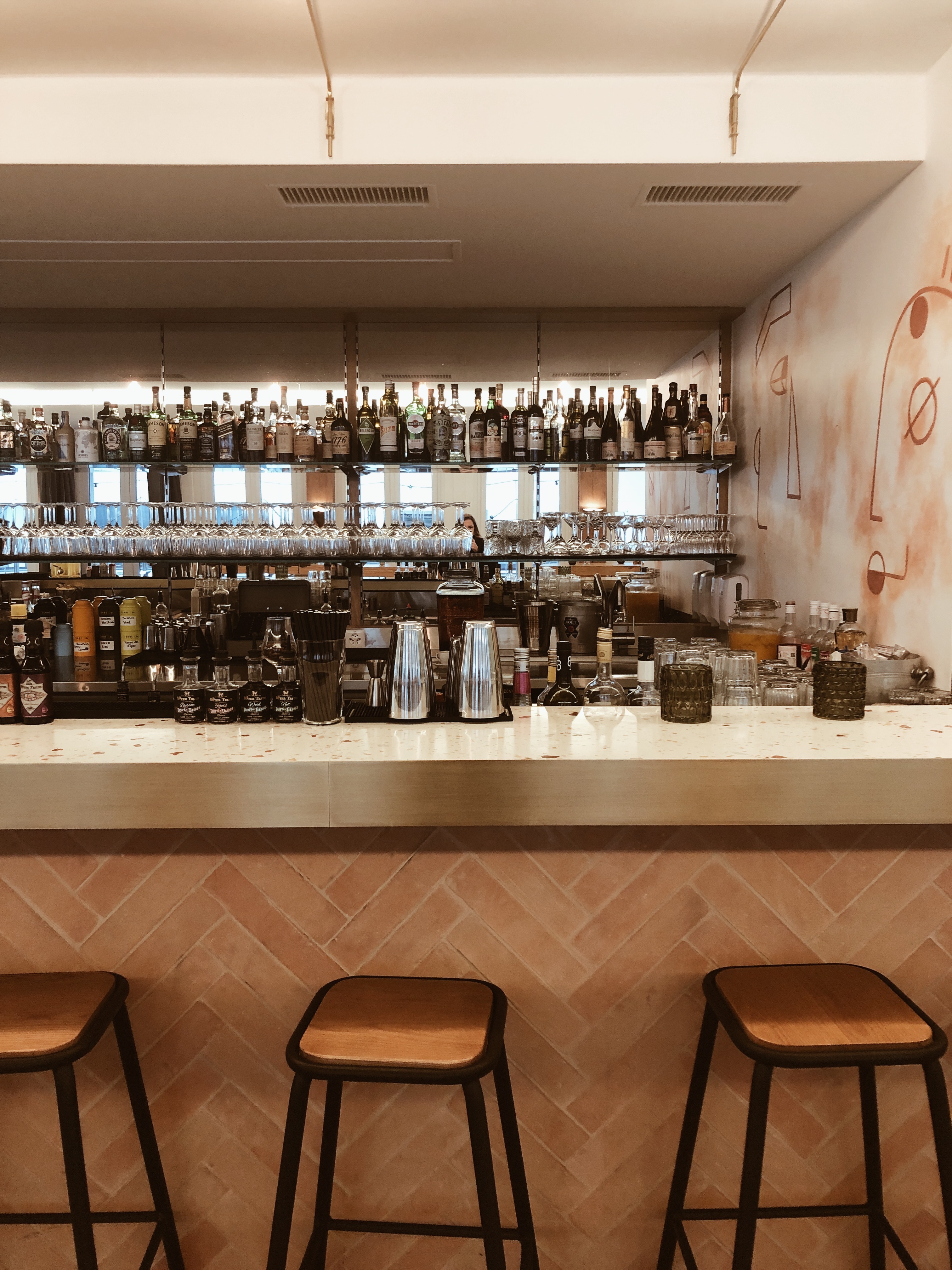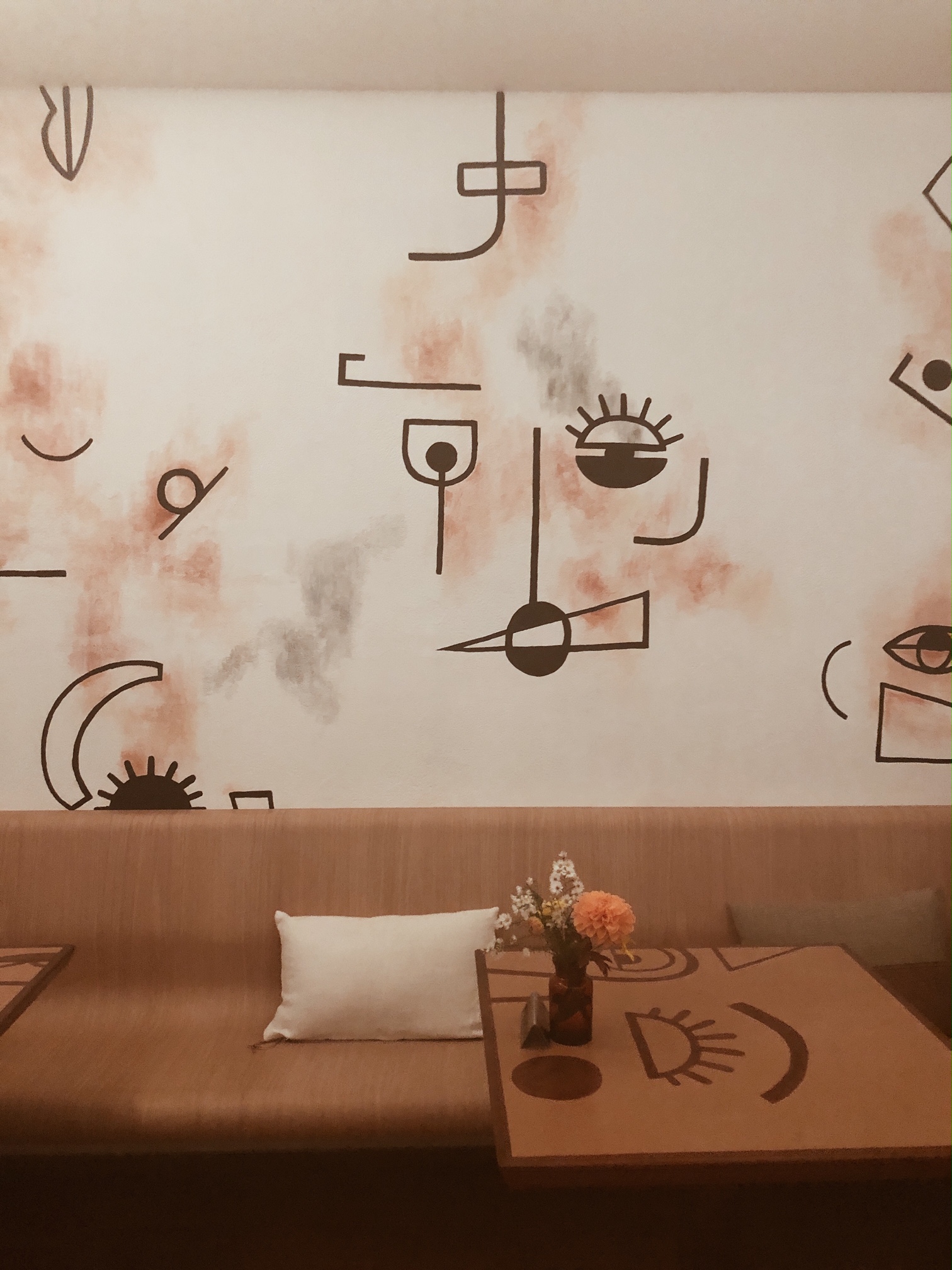 Autant le dire d’entrée de jeu, je suis plus que ultra fan de cette déco et surtout ce mur peint par Martina Bullson. J’y vois surtout un mix de Paul Klee, Picasso, Braque (mais pas Vasarely :-p). Certaines tables en reprennent d’ailleurs les motifs. D’autres sont à fond tacheté hyper instagrammables et les tables hautes sont neutres mais efficaces.