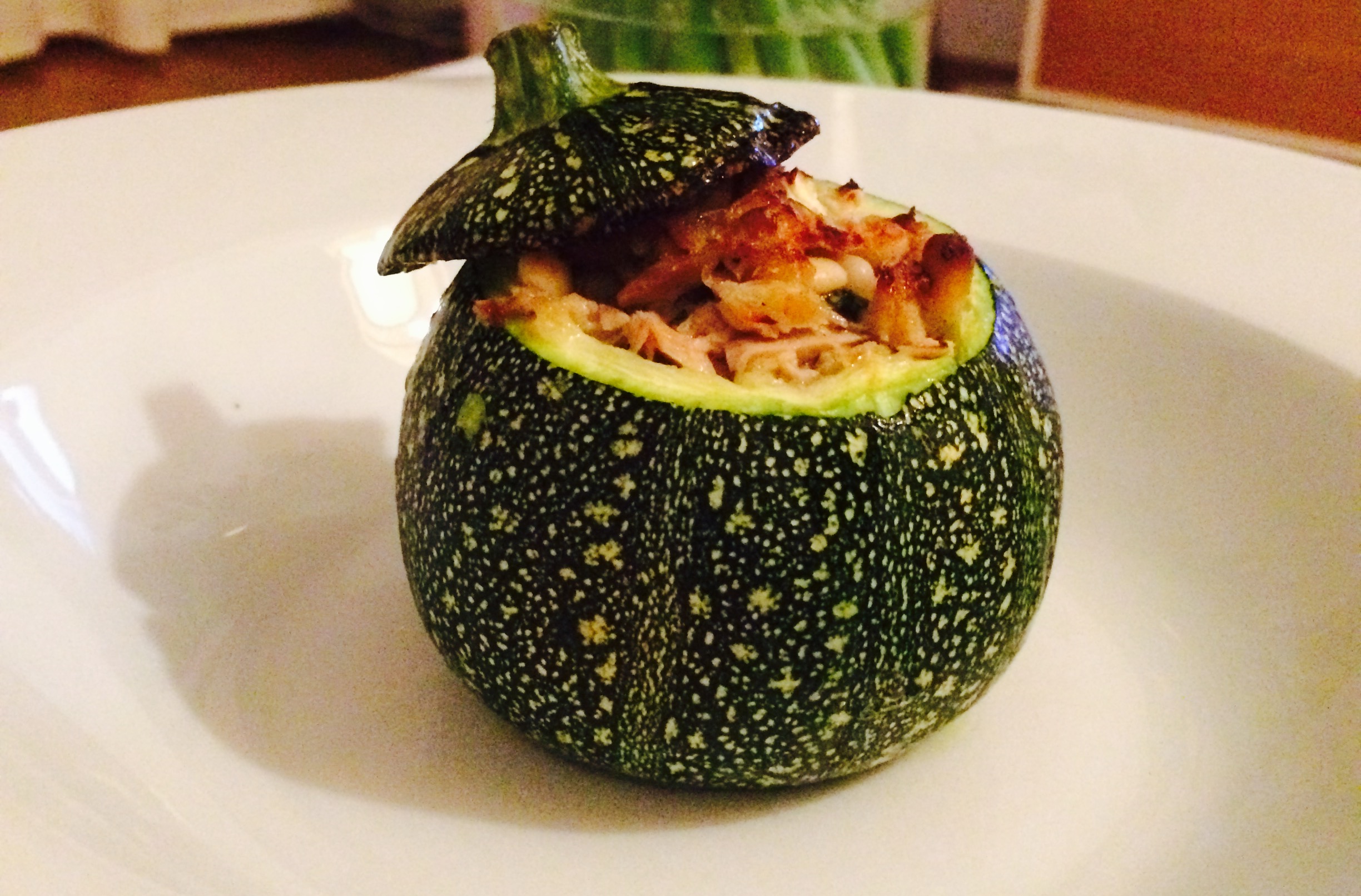 J’ai tout mis dans un bol en émiettant bien le thon. Ensuite découpe et vidage des courgettes (en coupant délicatement le chapeau). J’ai émincé un peu de la chaire de la courgette pour la mélanger à la farce.