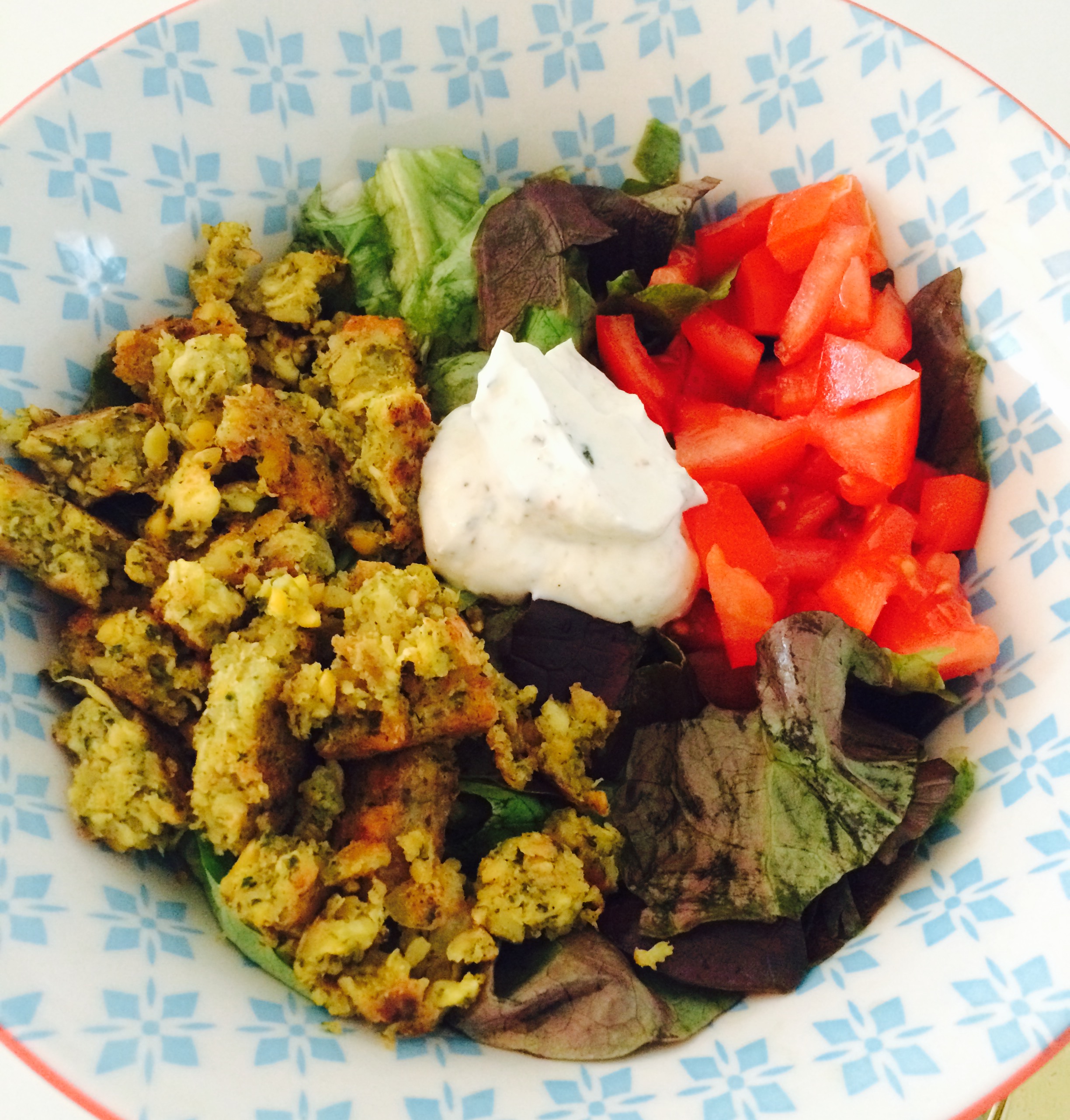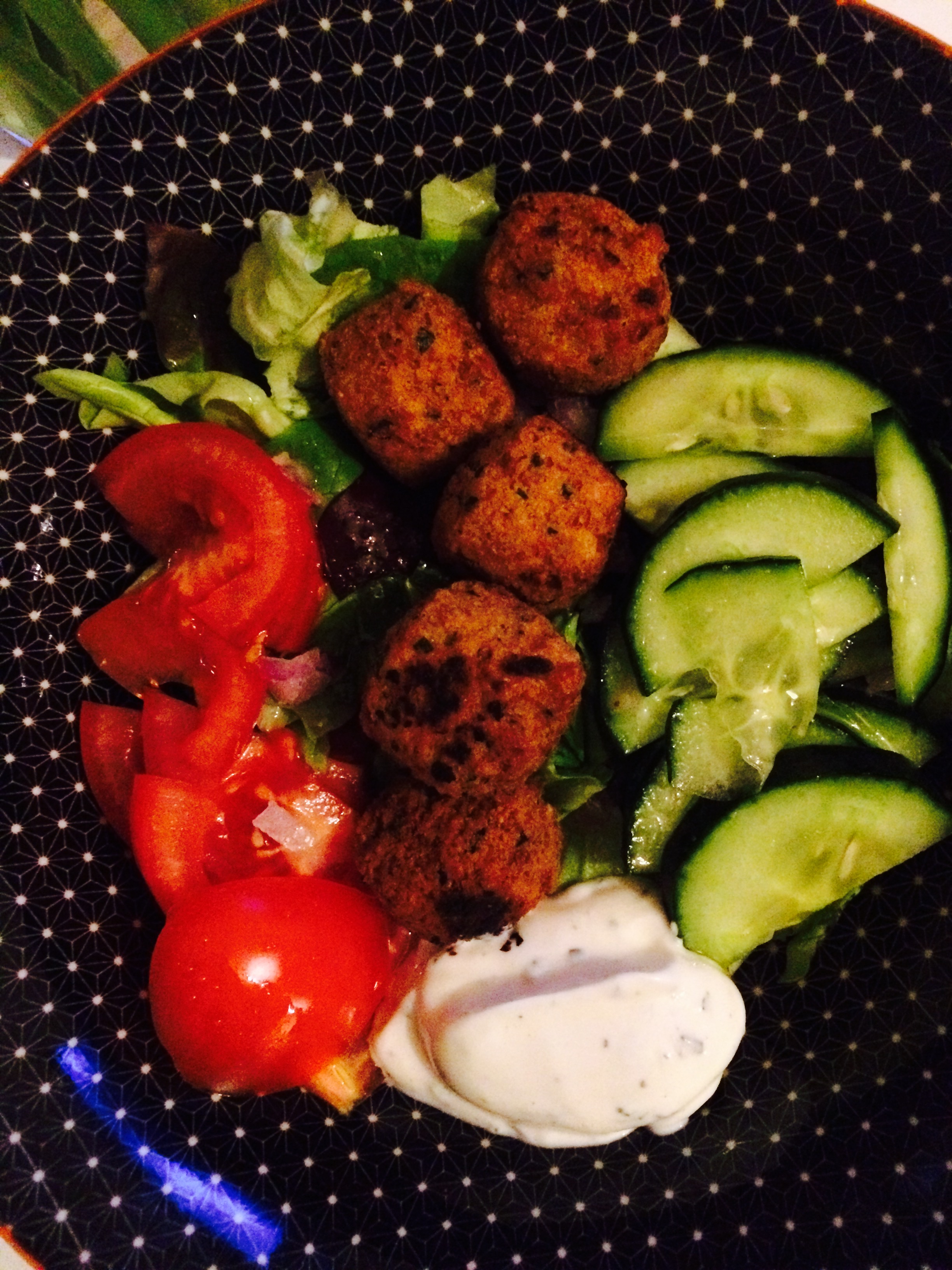 Pour la salade, j’ai utilisé de la salade verte, un peu de concombre, de tomates et des échalotes, disposés les falafels (ou les miettes pour le premier essai……) un peu de sauce blanche. Un délice.