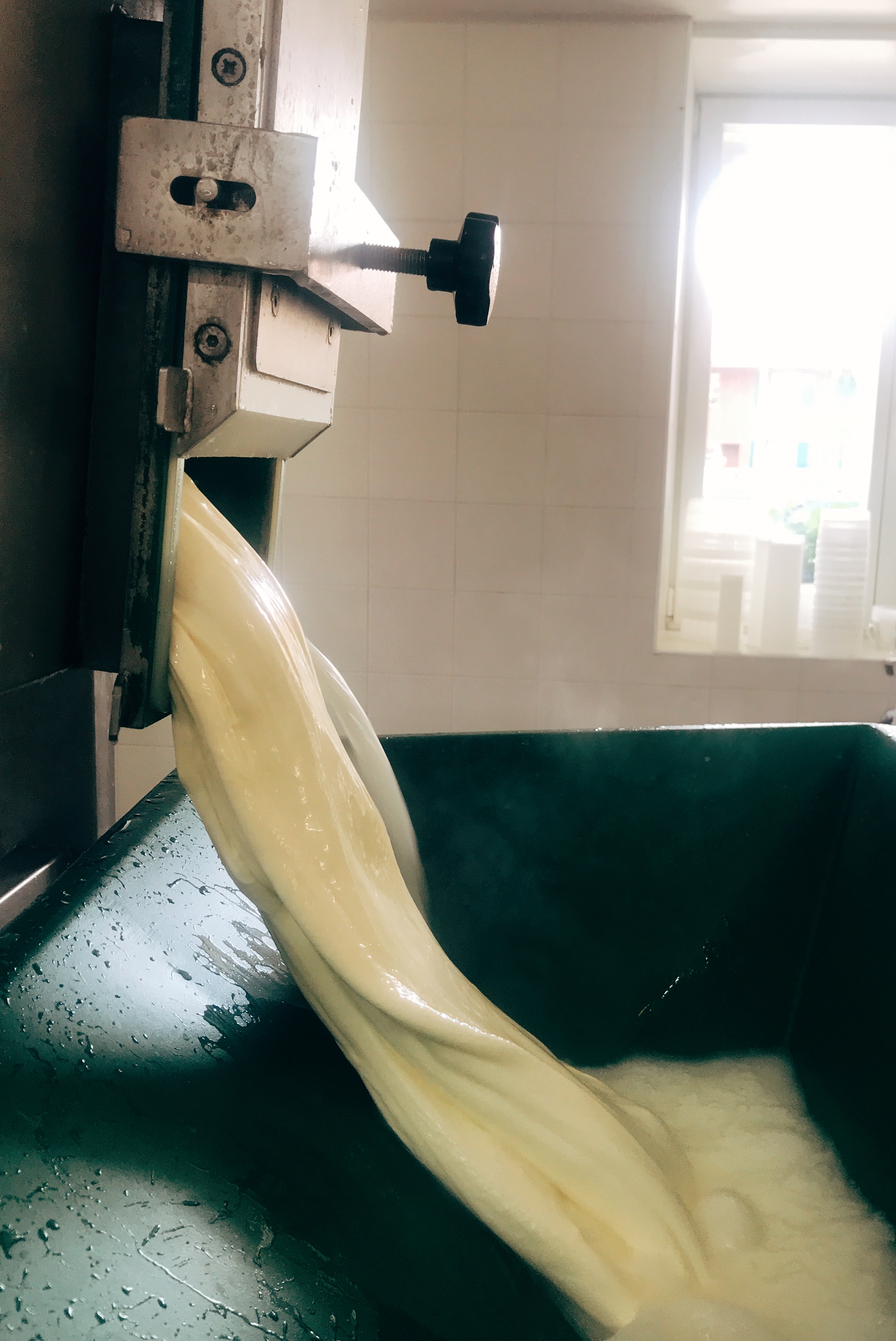 La production ayant lieu les lundis, mercredis et vendredis, ils nous avaient conseillé d’y passer entre 13h et 14h pour voir le filage de la pâte… Telles les bonnes suisses nous sommes donc arrivées à 13h tapantes… les dérangeant pendant leur repas de midi… oups.