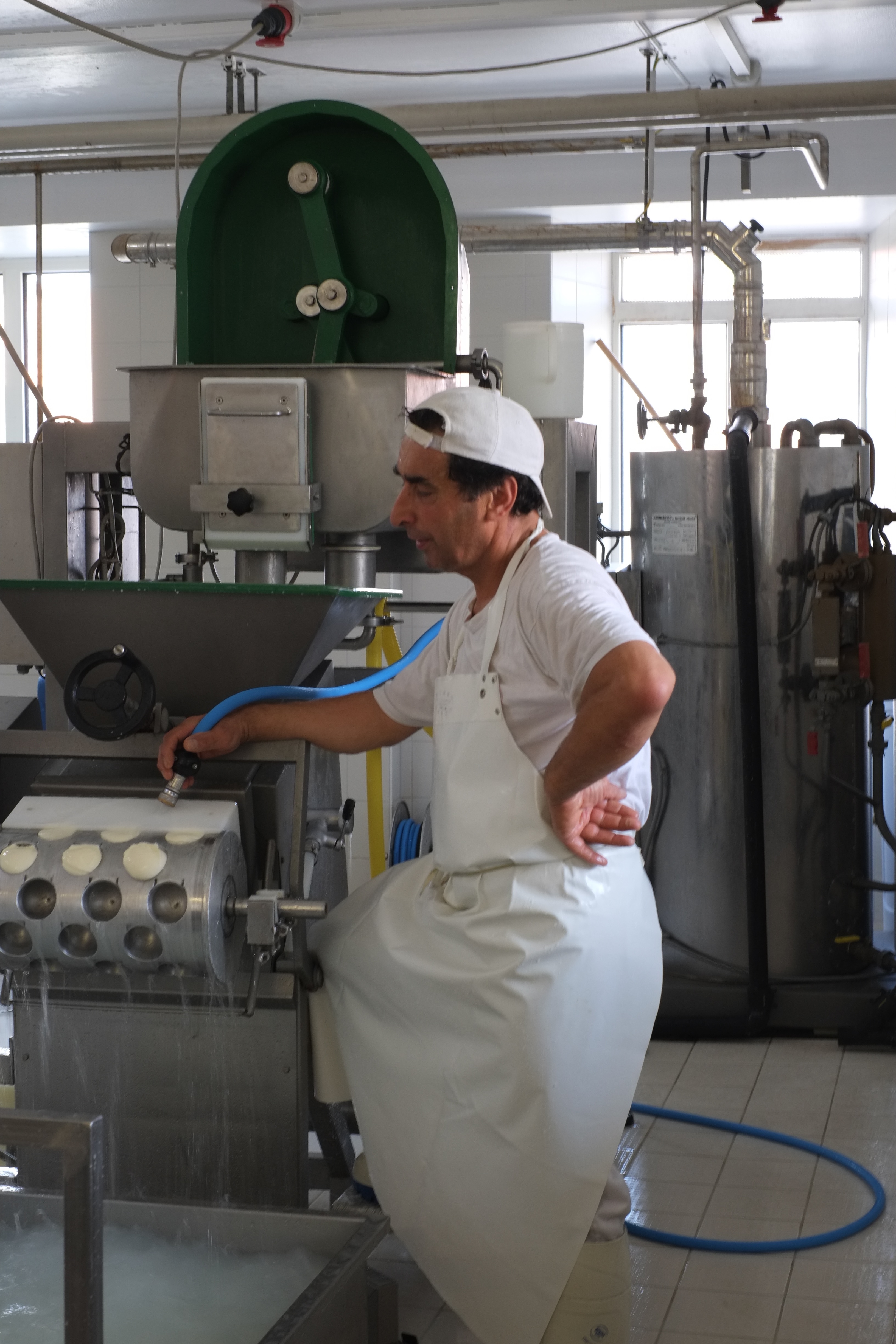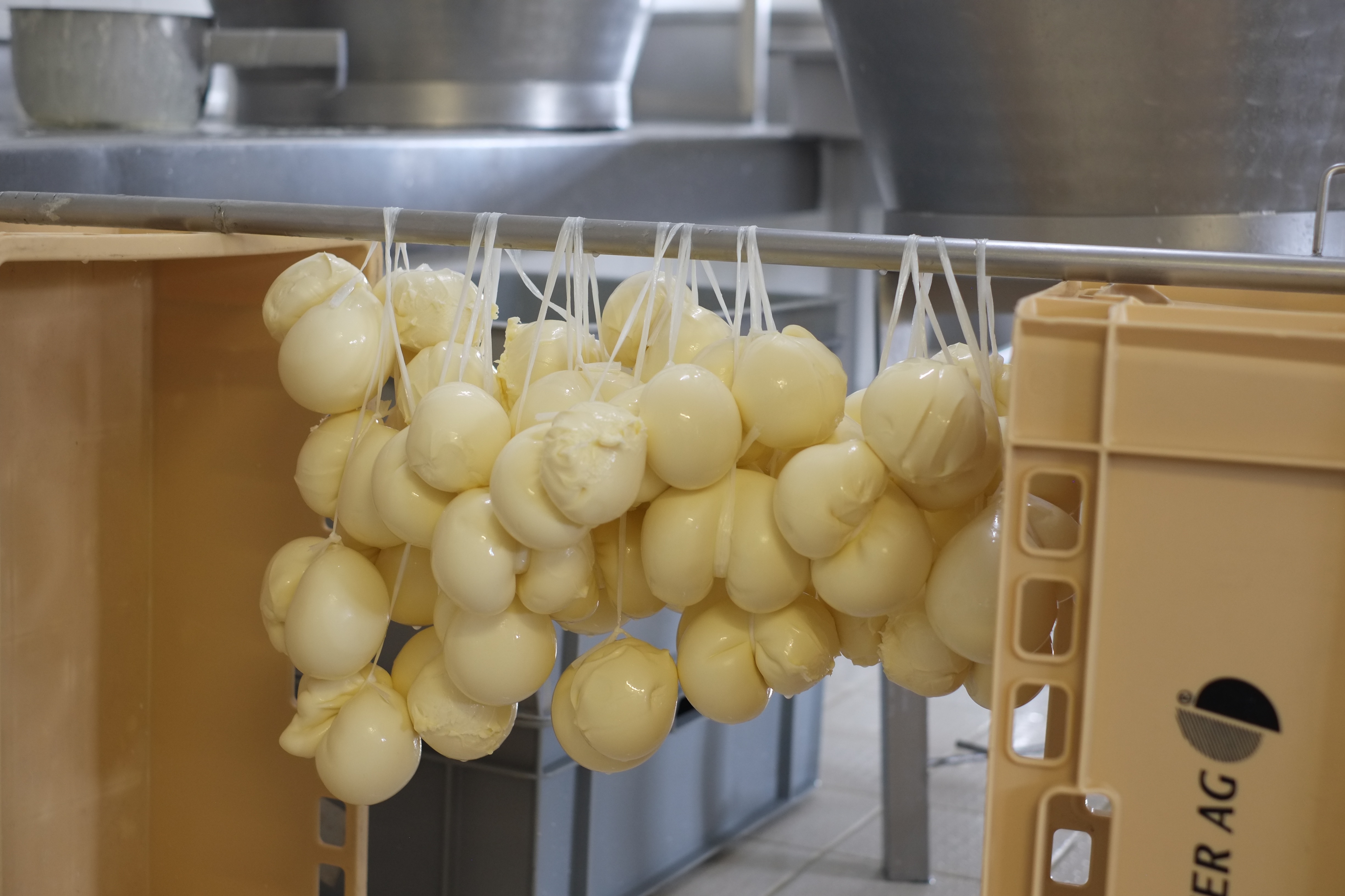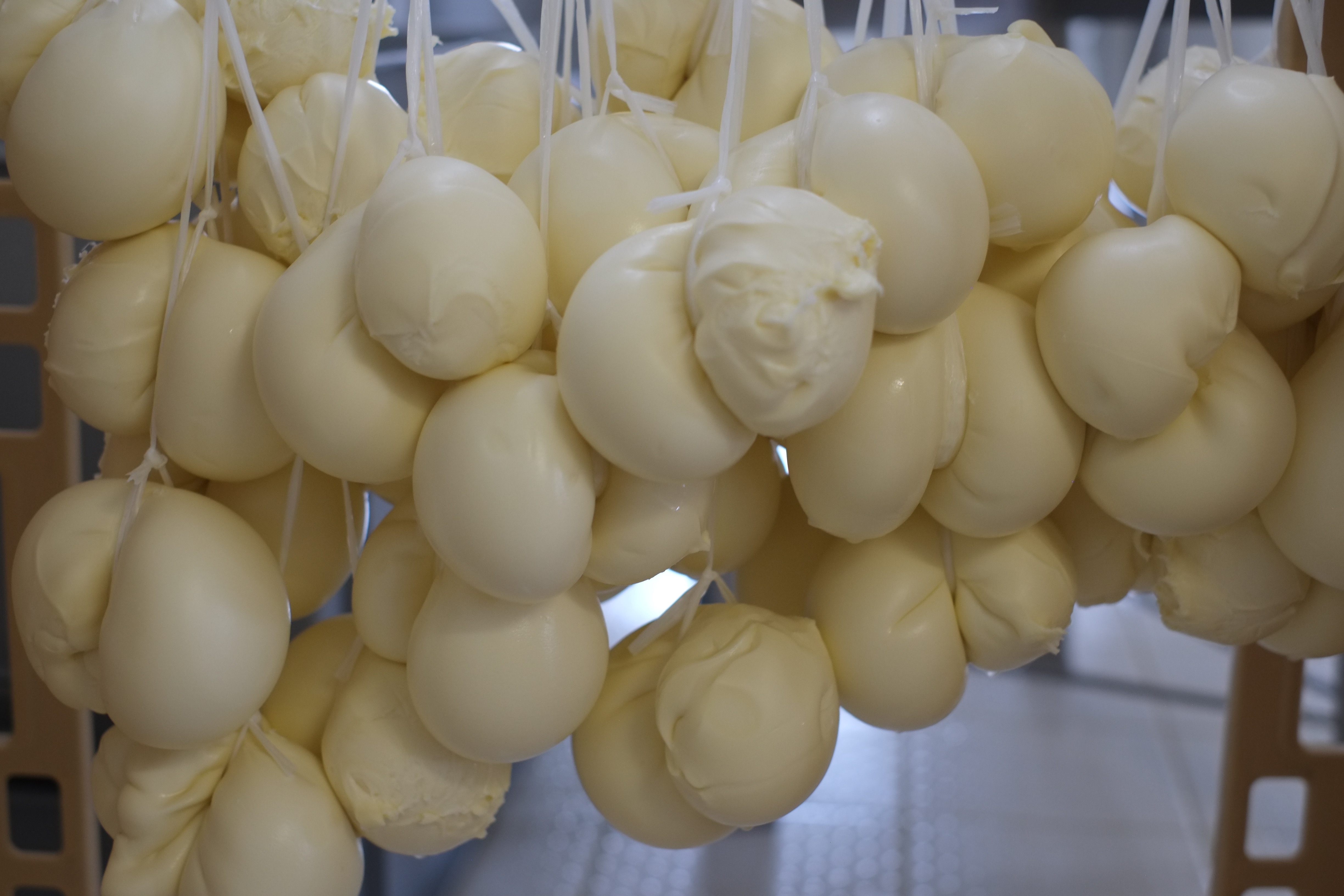 Ils commencent donc avec la scamorza, façonnée en petites boules accrochées par deux et stockées dans de l’eau froide pour arrêter la « cuisson », comme les légumes. Ce qui leur donne une forme de goutte (perso je voyais même encore autre chose mais bon…). Elles sont ensuite placées dans un gros bidon d’eau salée (saumure) pendant 1h et finalement séchées. C’était impressionnant de voir la couleur et texture changer au contact de l’air.