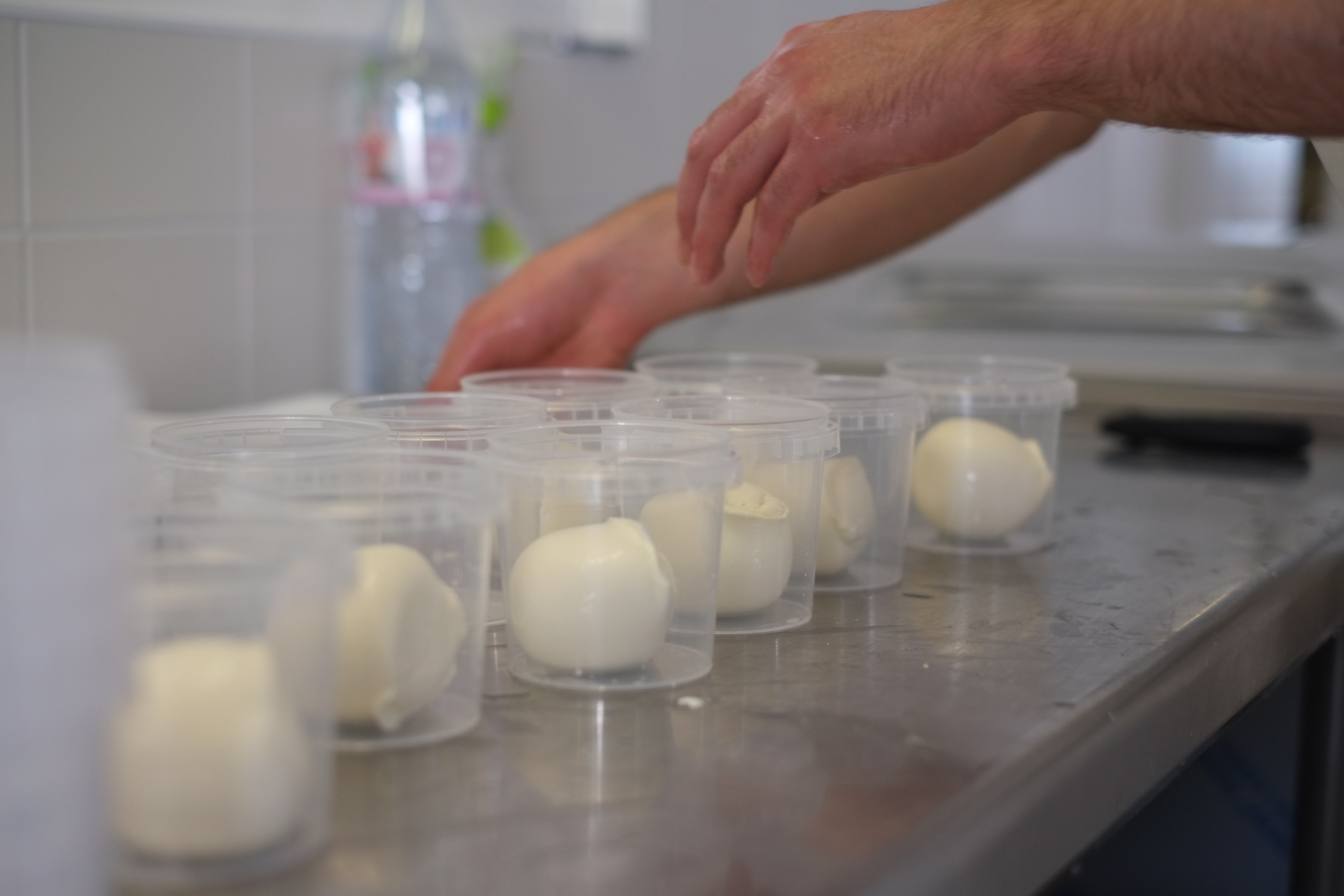Ensuite, on part sur la mozzarella, grosses et petites boules conçues grâce à des moules. L’un façonne, l’autre touille pour que la mozza ne chauffe pas et ne s’aplatisse pas non plus.