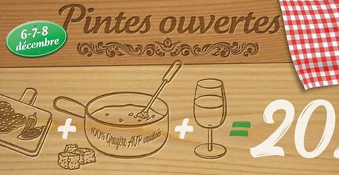 - Pintes ouvertes, du 6 au 8 décembre à midi. Soit de la charcuterie, une fondue et un pti verre de blanc pour 20.- !! Autant dire que si j’étais là…