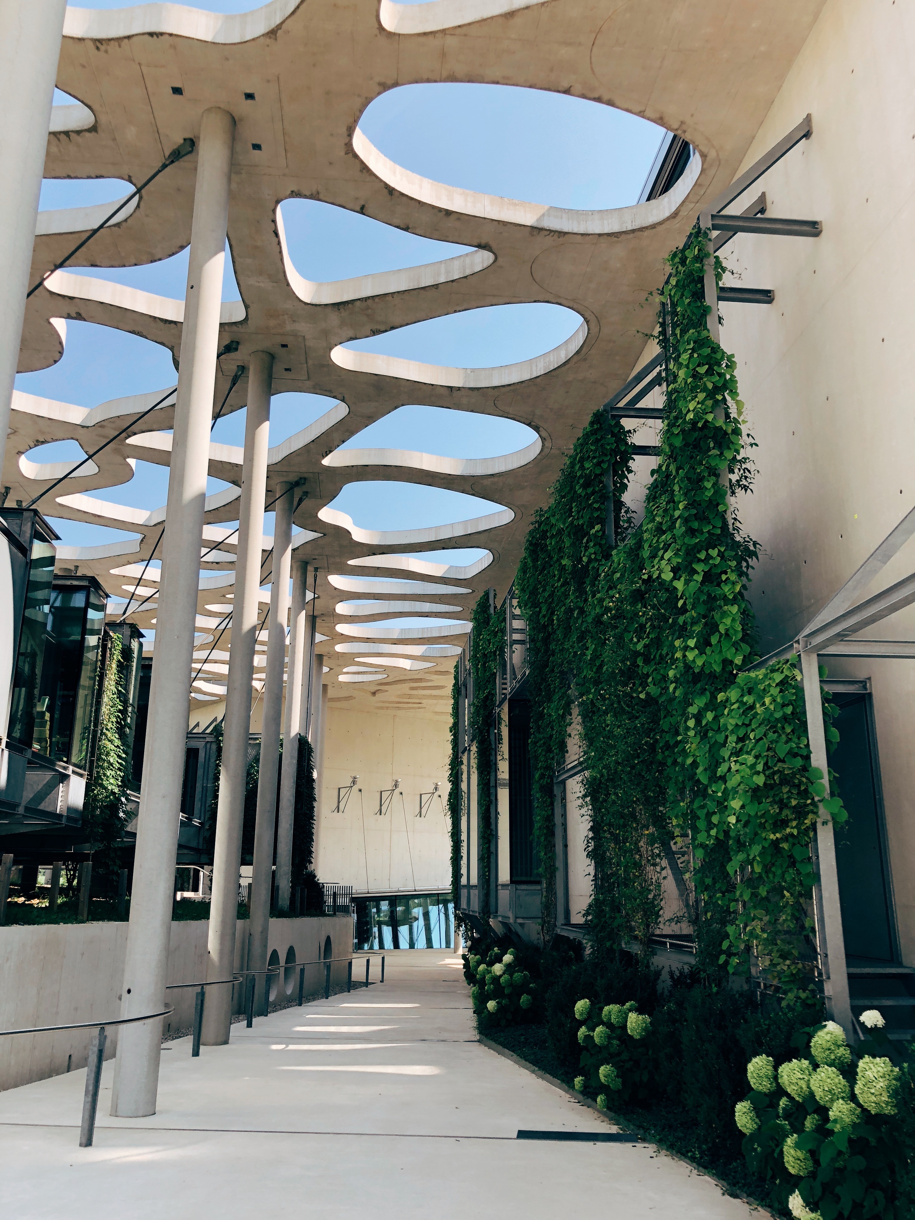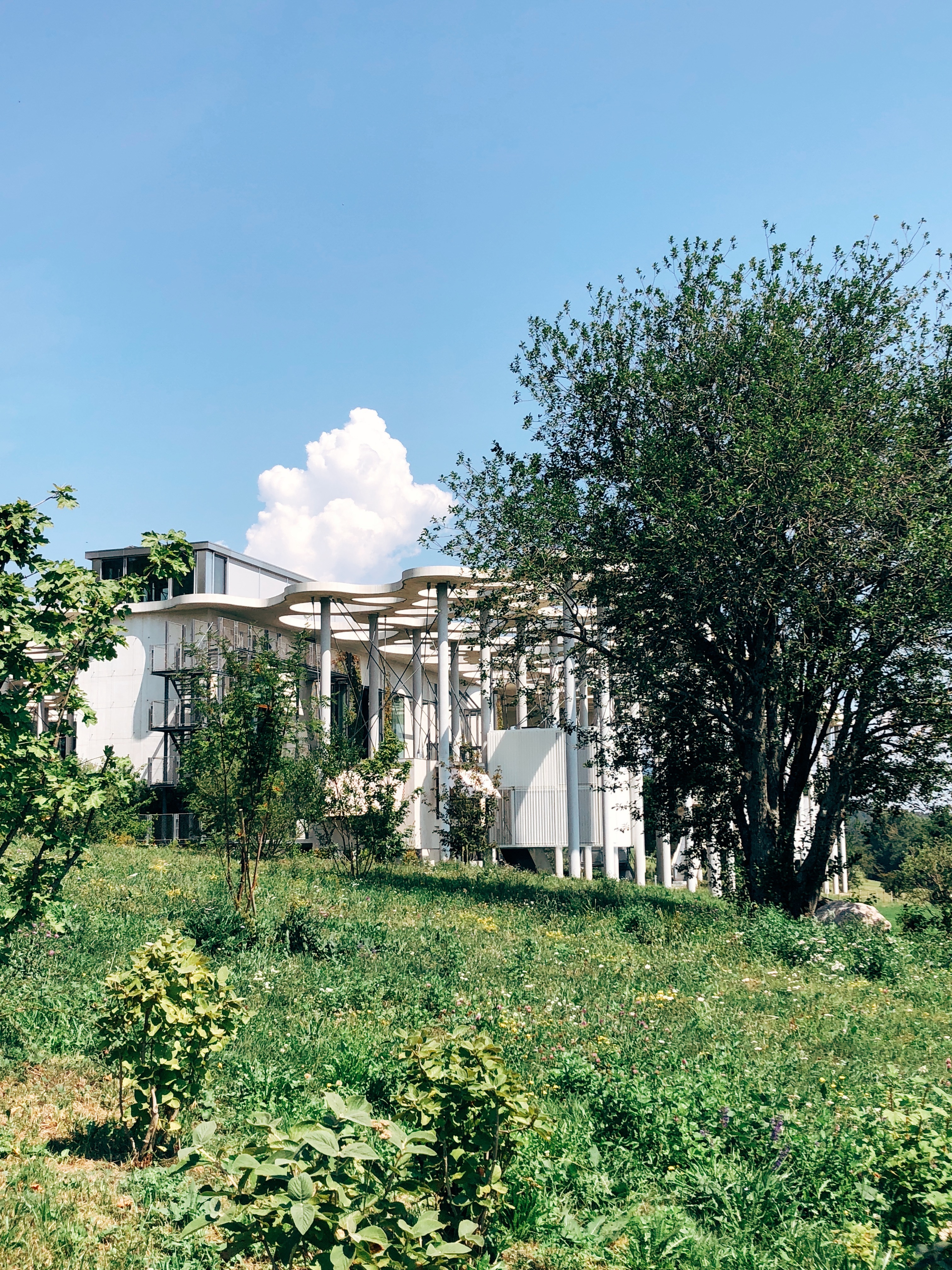 Je parque Gwendoline, sors de la voiture, bon il ne fait pas franchement plus frais, mais il y a tout de même un petit air… et là on prend 2 secondes pour s’en remettre. L’architecture est juste dingue !! J’avance lentement… difficile à croire que je suis à Montricher, à quelques kilomètres de Lausanne ou Morges . Honnêtement et sans vouloir en faire des tonnes, c’est assez rare que je sois scotchée ainsi. Le toit ajouré qui ondule, les lignes, les sortes de cabanes suspendues, bref scotchée !