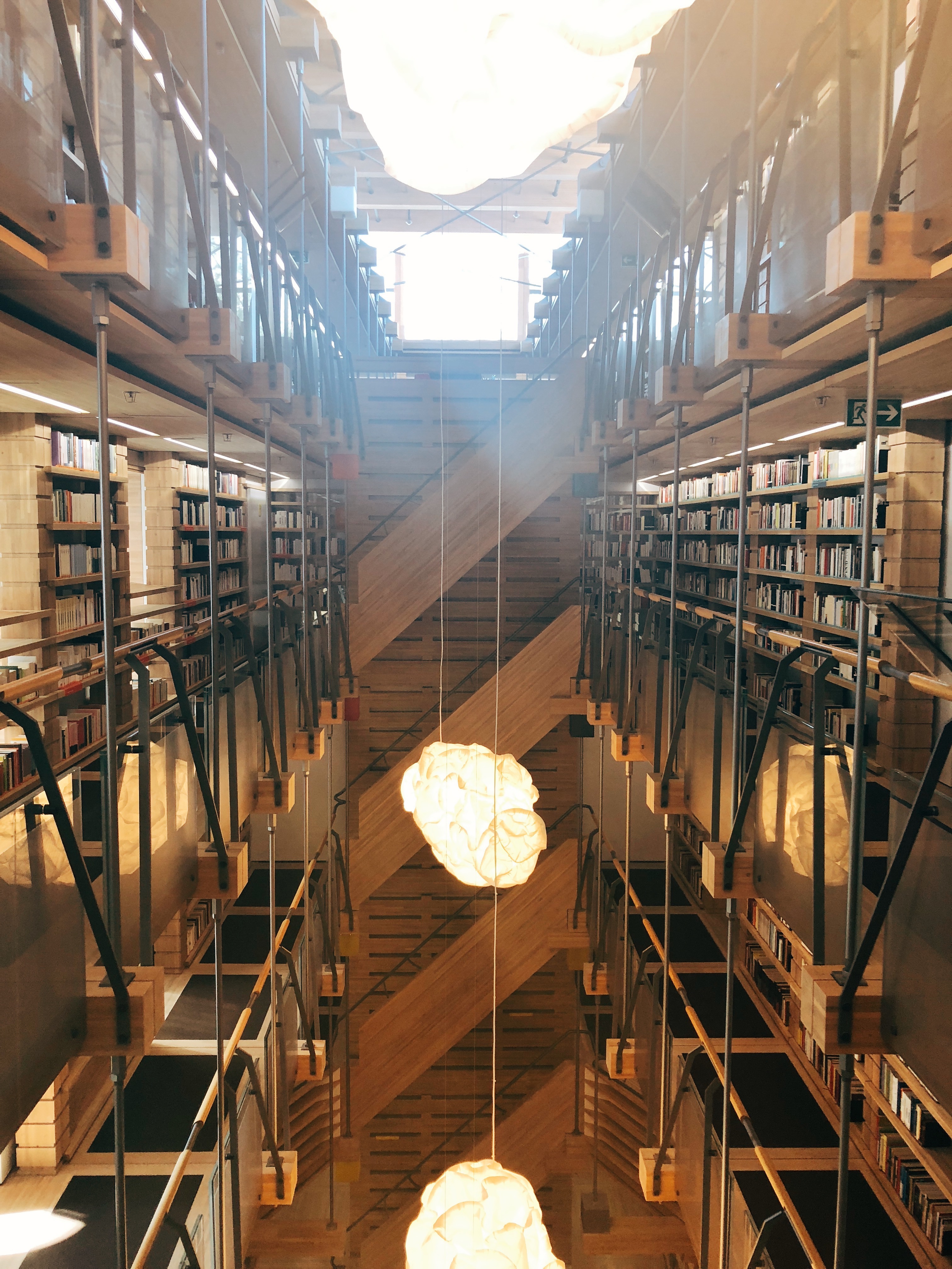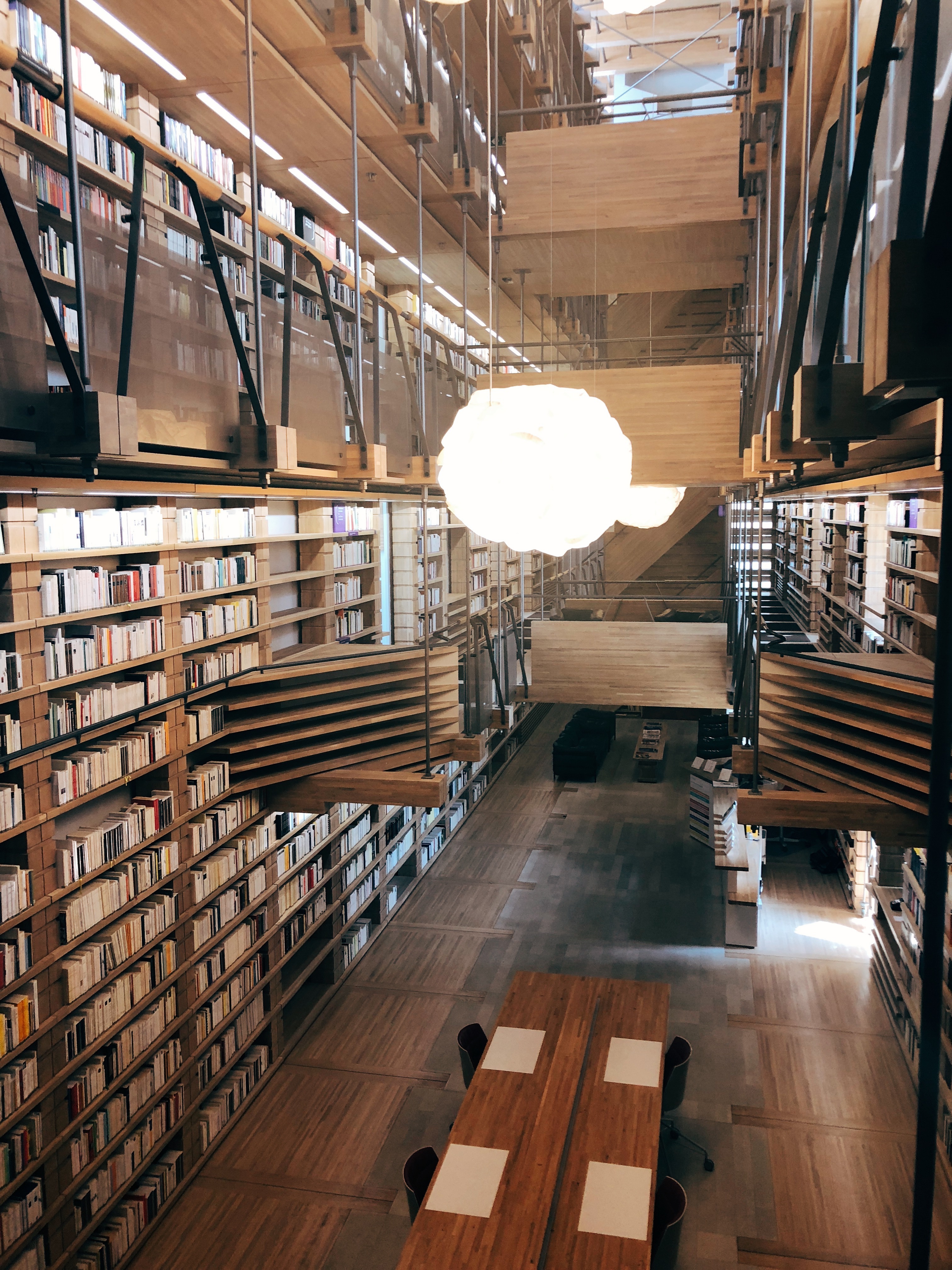 Là aussi, scotchée, le nez en l’air à tout scruter. L’architecture est dingue, tout de bois vêtue, des livres sur toute la hauteur des murs, des lampes nuages, on est comme dans un rêve, un petit cocon. Vous montez par des escaliers et côté plaine, retrouvez des petites alcôves privées pour étudier avec vue sur la campagne. J’aurais peut-être mieux étudié à l’uni dans un cadre pareil… ok je plaisante, le problème n’était pas là.