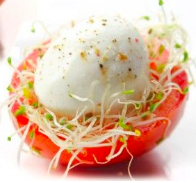 - petite boule de mozzarella dans un nid de tomate cerise et pousses d’oignons