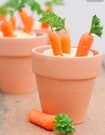 - pour l’apéritif des dips de carottes, humus, dans un pot en terre cuite et des petits sandwiches taillés en forme de lapin et un cocktail aux fruits rouges dans un mason jar