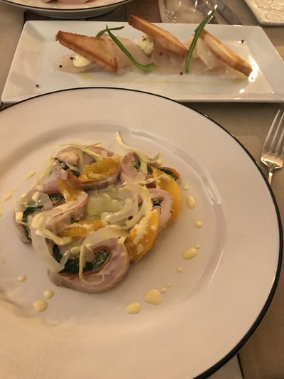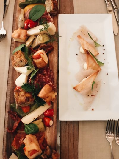 Tout commença par un petit amuse bouche, un feuilleté au fromage blanc tout mignon pour nous ouvrir l’appétit, arrivent ensuite 2 énormes plateaux d’antipasti (qui auraient limite suffit comme repas, mais on était pas là pour faire léger) avec des légumes grillés (poivrons, artichauts), de la charcuterie, des fromages, des petits poivrons farcis, de la foccacia maison, une pure tuerie et un clafoutis thon olives je crois, un délice.