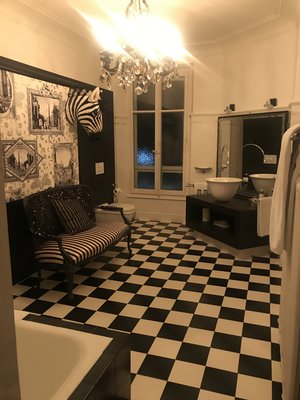 On a même pu visiter une des chambres, la Pulcinella, avec un petit spritz à la main, qui doit faire, à peu de choses près la taille de mon appart, et la salle de bain celle de mon salon. Simple mais avec beaucoup de charme et de cachet, j’y serais bien restée.