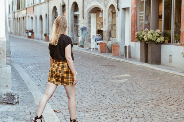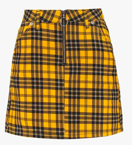 Si les couleurs habituelles sont plutôt des carreaux rouges verts bleus, cette année c’est aussi le retour du jaune (poussin ou cocu…). Pour changer un peu et comme je ne suis pas certaine d’aimer le rouge-bleu-vert sur moi, j’ai opté pour cette mini (oui elle quand même très, voire trop, mini pour moi) jupe Topshop jaune moutarde.
