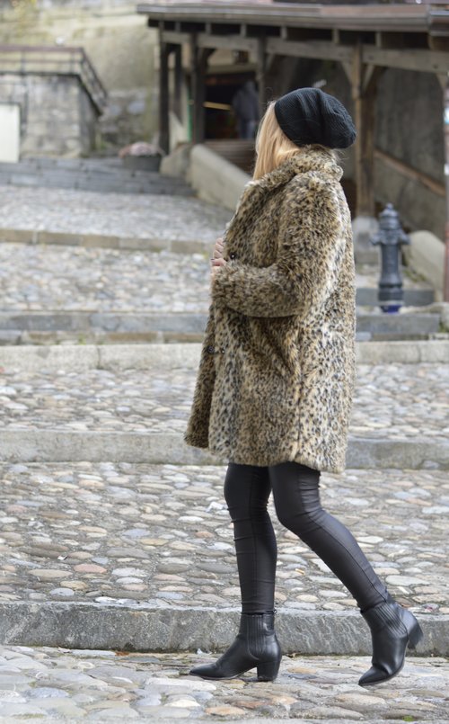 Pull: H&M – Manteau léopard: old – pantalon similicuir: old – bottines: old – bonnet: old
