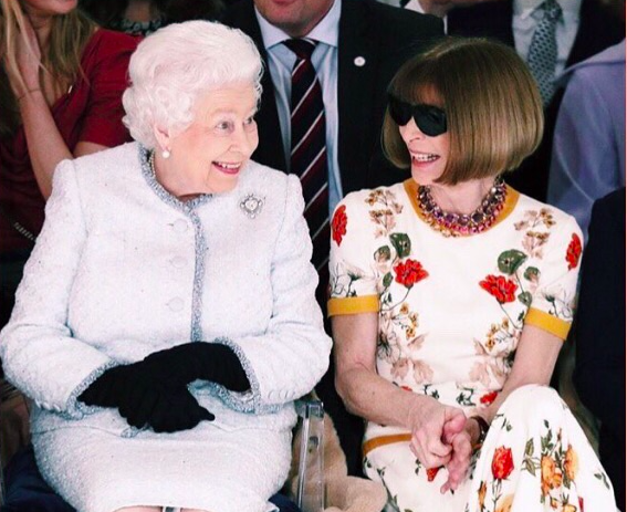 - la reine qui se fait la front row de la London Fashion week au côté d’Anna Wintour